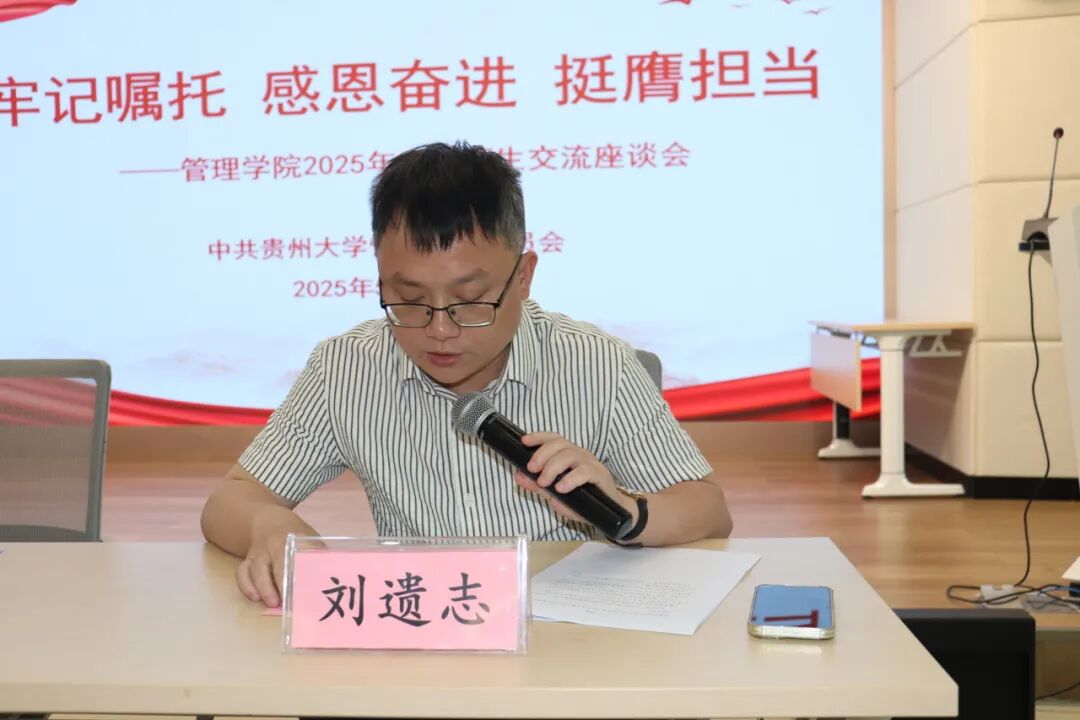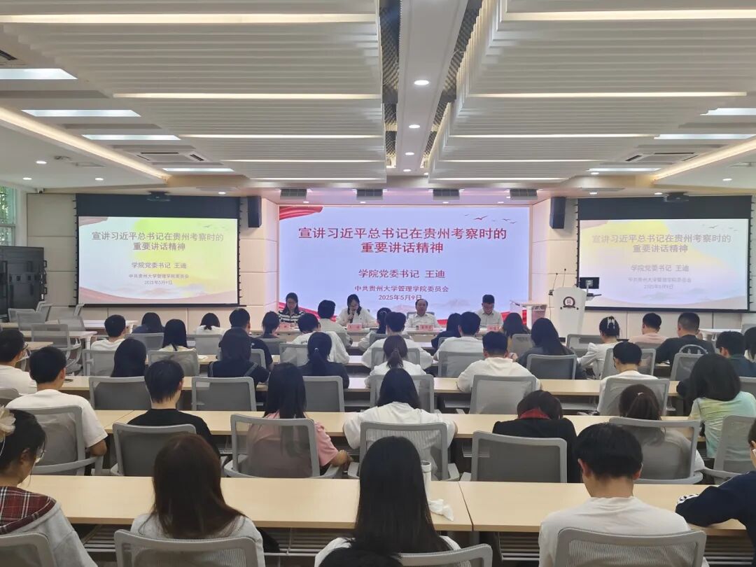 学院党委委员刘遗志传达学习《省委书记徐麟在贵州大学宣讲调研》,徐麟书记指出,新时代以来,贵州各项事业大踏步前进,全省加快高质量发展,为青年建功立业提供了广阔的舞台。他勉励大家永葆感恩之心,珍惜青春年华,全方位提升能力。